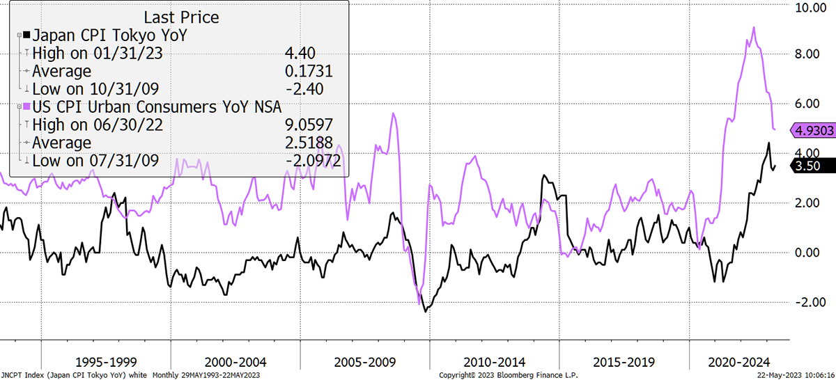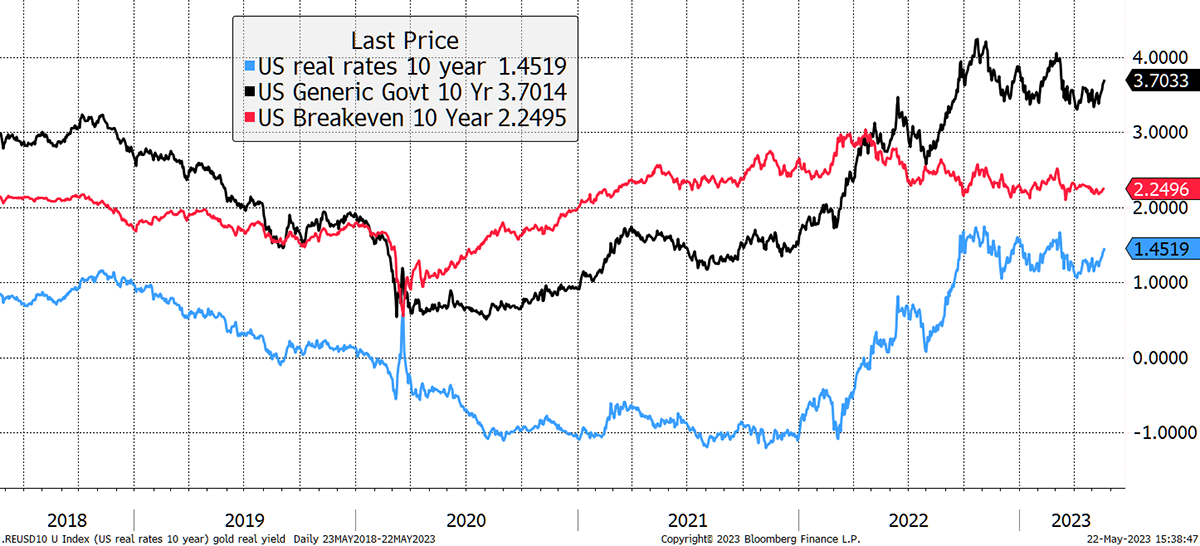 Inflation is seemingly under control (4.9% and falling), at least for the time being. US interest rates are at 5.25% while the 10-year is at 3.7%. That means the bond market is pricing in six rate cuts which would only happen in a deep recession. Bond yields are rising again, which might mean the imminent recession call is too harsh. But let’s not forget that if the bond yield breaches 4%, bad things happen. Last October, we lost another UK government, and in March, we lost a handful of banks.