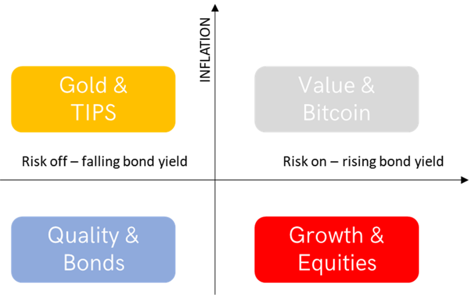 This is an important shift because in recent months, and as bonds recovered from the Truss/Kwarteng crash last autumn, high-quality stocks have been doing well. Now that bond yields are rising again, quality has come under pressure, and growth is back in the sweet spot. A quick reminder of the Money Map as we move into the red growth regime.