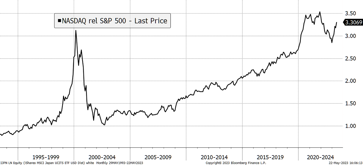 What was interesting about that time was how the internet and telecommunications caught the public imagination, with macroeconomic conditions that drew money into the USA. I don’t think the message here is to buy the S&P 500 or Europe as much as it is to buy growth. Certainly, that has been the message from the NASDAQ over the S&P 500 this year.