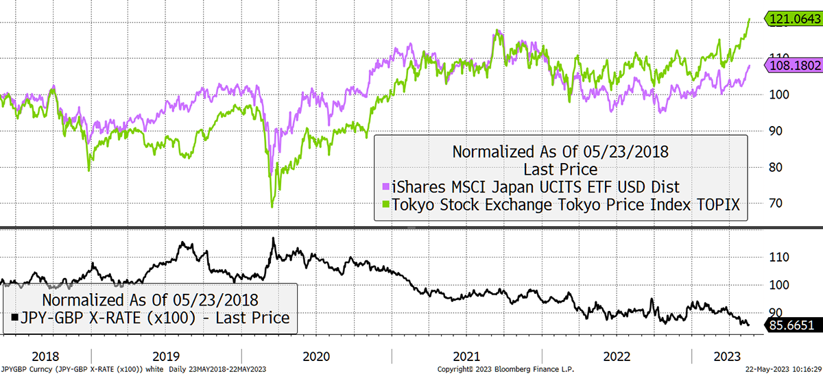 A weak yen flatters the Japanese stockmarket in yen terms, just as a weak pound flatters the FTSE in GBP terms, as we saw over the Brexit vote. The pound fell as the FTSE rose. Here I show the Japanese market in yen (green) looking good. When measured in GBP (purple), it is 13% behind, which reflects the GBP vs JPY (black) change in the FX rate.