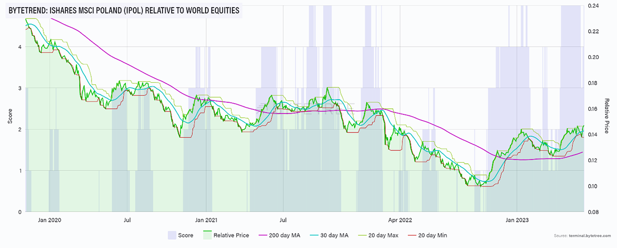 Poland had been lagging the world index since 2020. That is until recently. With the Polish stock market now rising faster than the World Index (WI), the situation has improved. The green line is above the 30-day and 200-day moving averages, which are both upward sloping. It also recently touched the max line. With 5 good things going on, this trend is awarded 5 stars, which are highlighted by the blue fill in the background.