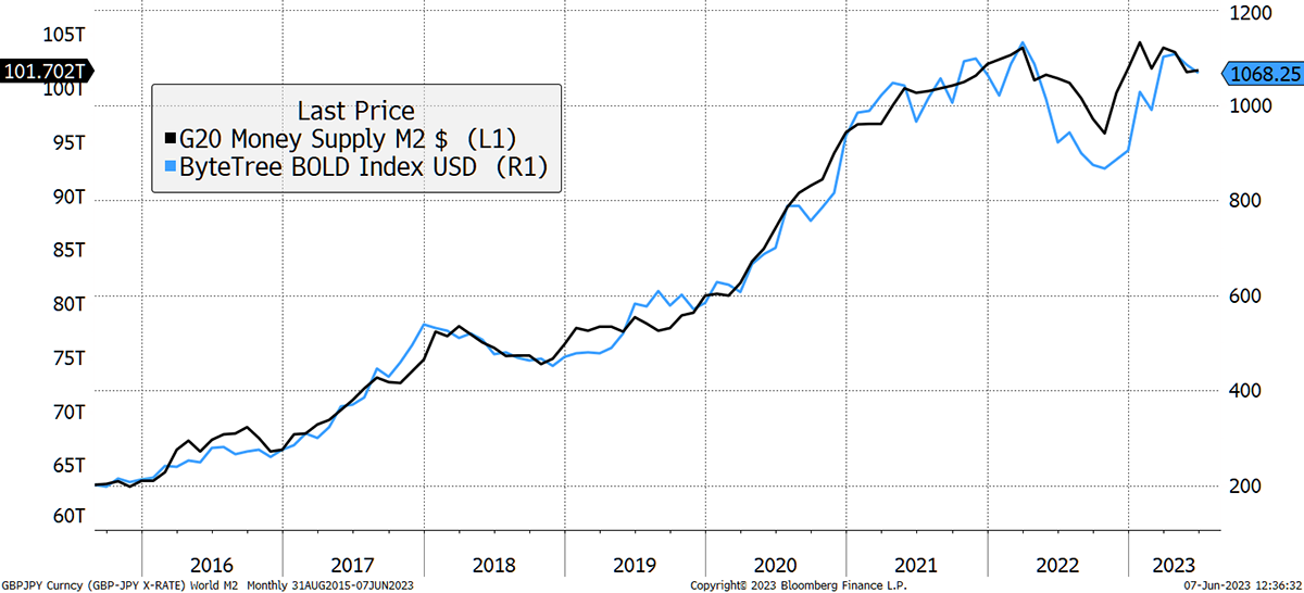 There’s one more thing about BOLD, it can predict the future global money supply more closely than any other asset or combination. That might be shrinking in the short term, but they always say the only two certainties in life are death and taxes. If I were to add a third, it would be printing money.