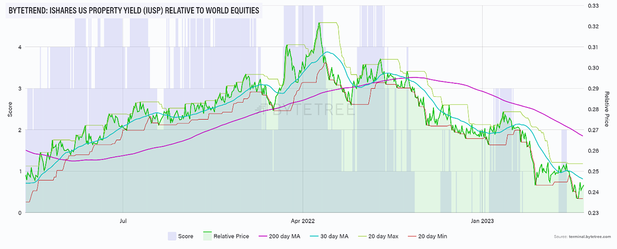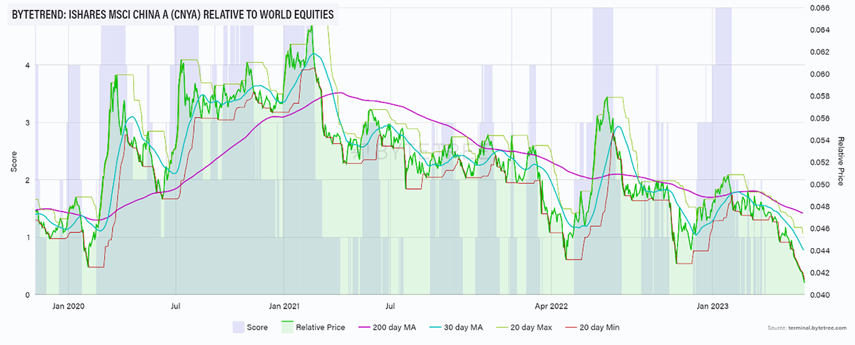 There are losers too. China A Shares have made a post-pandemic relative low versus WI. The green price relative line is below the moving averages, which are negatively sloping, and it recently touched the min line. China scores nil points and hence the chart background is white. China is not definitely facing a crisis, but if it was, the chart might look like this. Conversely, a country with a stronger chart relative to WI is unlikely to be facing a crisis.