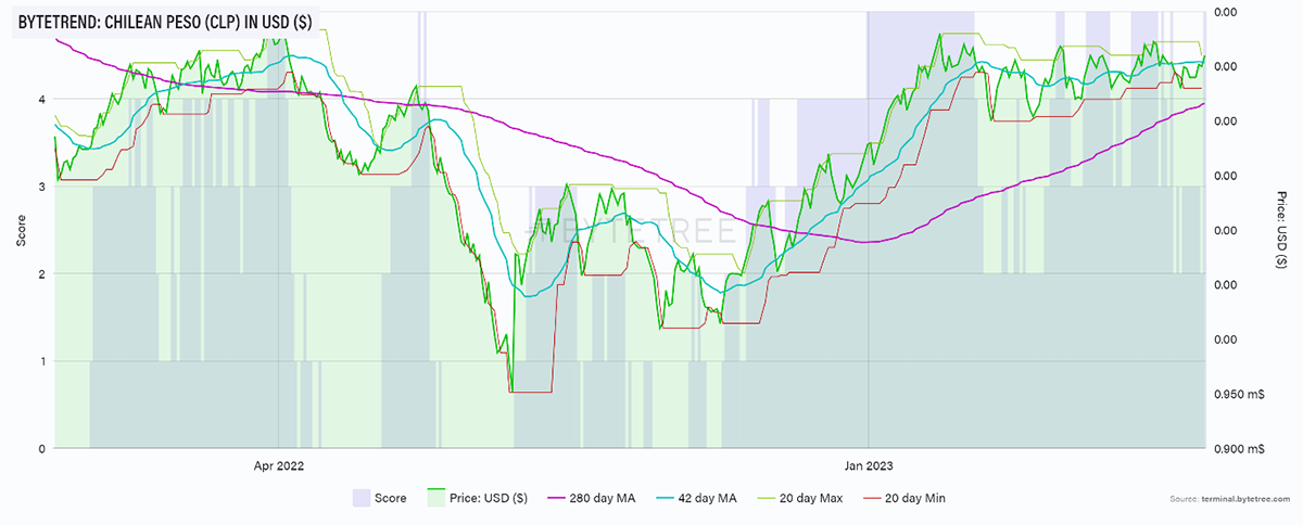 The Chilean Peso is accompanied by the Brazilian Real and the Mexican Peso.