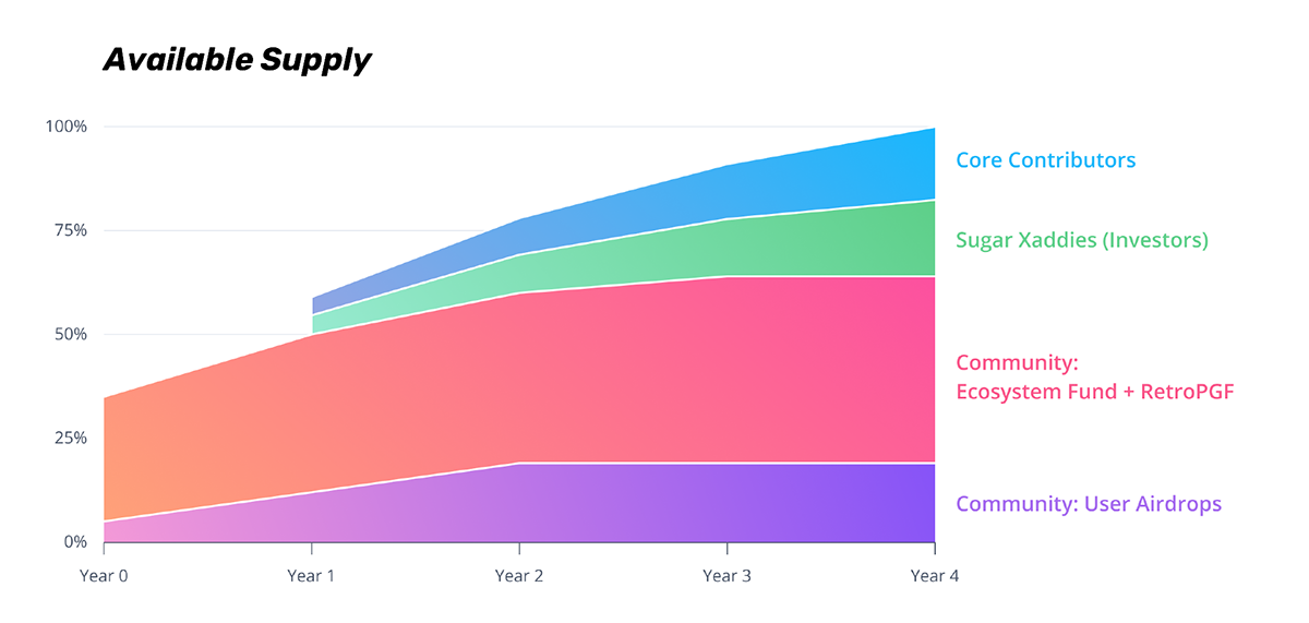 The illustration below highlights the available supply of OP tokens, but it should be noted that the actual circulating supply will depend on governance decisions and the allocation rate for user airdrops, the Ecosystem Fund, and RetroPGF.