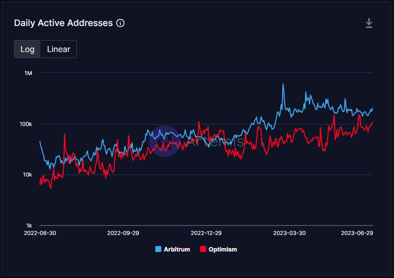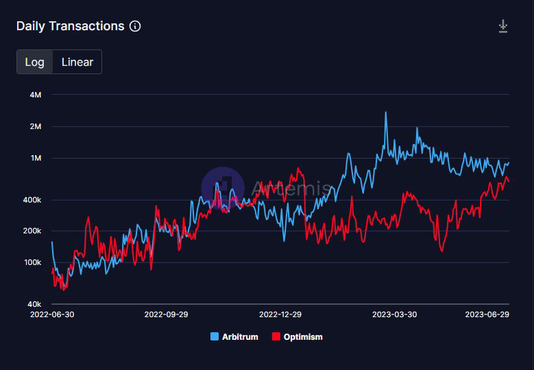 The story is no different when comparing the number of active daily addresses and daily transactions. Both chains have an upwards trajectory in the number of active daily addresses and daily transactions. However, Arbitrum boosts a larger number of active users, but Optimism is not far behind in these figures, as illustrated in the chart below: