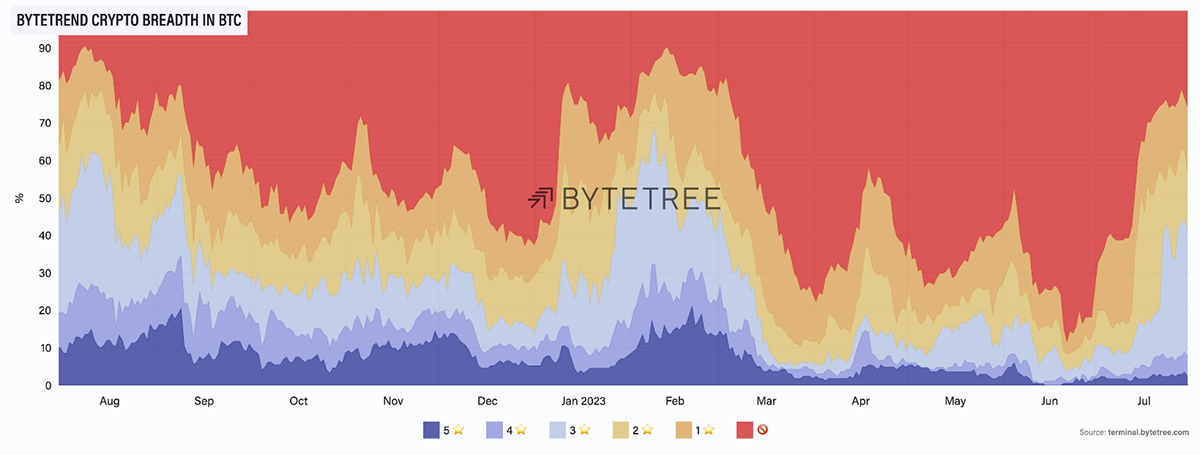 Similarly, the ByteTrend Crypto Breadth chart measured in BTC also exhibits a decline in red trends, but tokens with 5-star trends are relatively scarce. This highlights Bitcoin's strength, as only a few tokens can rival its robust performance.
