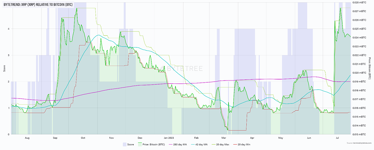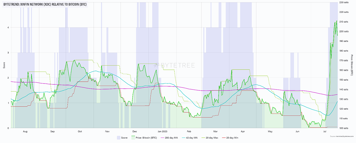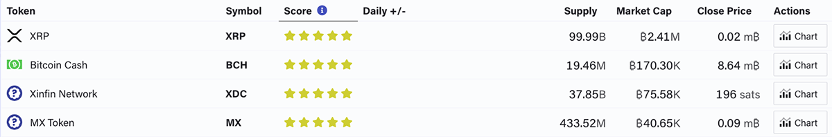 Currently, there are four tokens with a 5-star ByteTrend score against BTC: Ripple (XRP), Bitcoin Cash (BCH), Xinfin Network (XDC) and MX Token (MX).