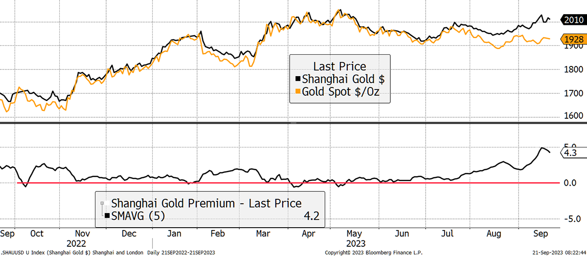 In August, China continued to build its reserves, and the Chinese ETFs saw inflows. That contrasts with the rest of the world’s gold ETFs, which have seen significant outflows. The Shanghai Premium narrowed slightly on Monday as the People’s Bank of China lifted temporary curbs on gold imports. Yet it has widened again.