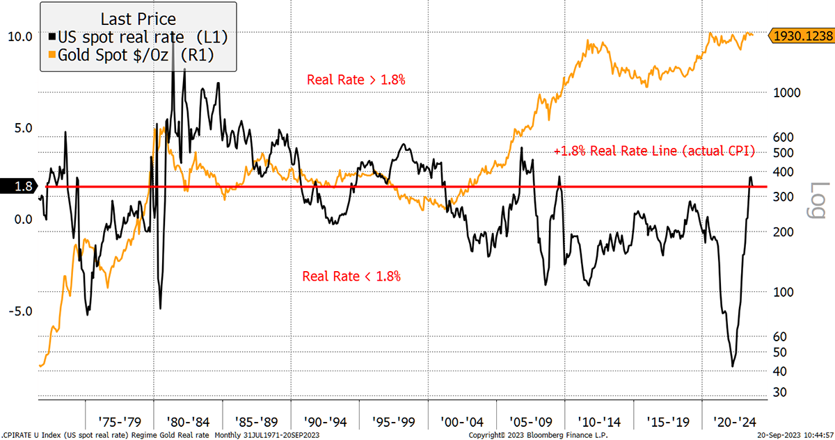 The final test is more worrisome for gold because real interest rates (the base rate less inflation) is 1.8%, which is the threshold. Historically, when real rates have been above 1.8%, gold has been in a bear market.