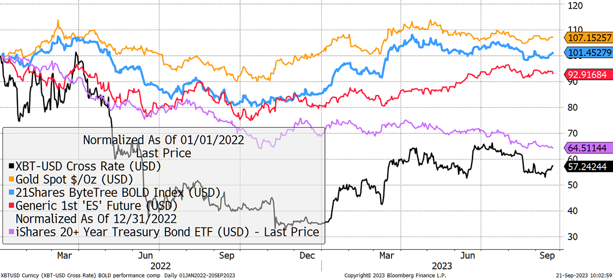 The recent malaise in markets began in January 2022. Since then, US Treasuries are down 36% and the S&P 500 8%. Gold is up 7%, with Bitcoin down 43%, yet BOLD has been remarkable under the circumstances.