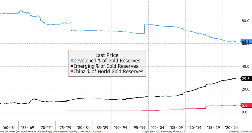 5.9% seems low for the world’s second-largest economy. For reference, Europe holds 11.7% of and the USA 22.8%. Putting it all together, the developed share is falling while the emerging share is growing. Recent behaviour by the PBOC suggests that China is keen to catch up.
