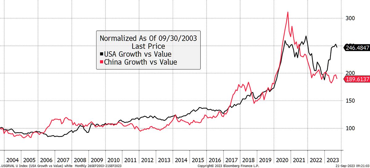 There are many ways to show economic activity in China, but official GDP statistics are best avoided. Since 2006, the Growth vs Value trajectory for Chinese and US stocks has been a close match. That is until recently. The chart is rebased, which highlights both the extent of the growth and the fit. Both have been remarkably similar for 20 years, yet something has changed.
