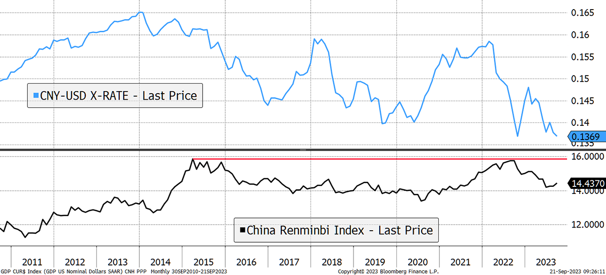 It might look as if a devaluation began in 2014, but it didn’t. That is demonstrated by the lower chart where the Yuan is measured against a global currency basket ex USD. It has held up remarkably well and only started to devalue in mid-2022 and has recently bounced off the ten-year low.