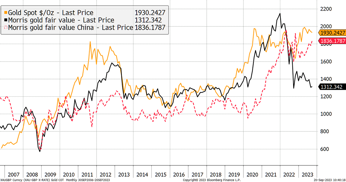 Let us not forget that low rates are good for gold. My gold valuation model is boosted by low rates and high future inflation expectations. The worst scenario is high rates and falling inflation, which is more or less where we are today. The great hope for gold is that inflation proves resilient while rates come back down. Using US rate data, the fair value has slumped to $1,312, which is brutal and reflects how tight monetary conditions already are.