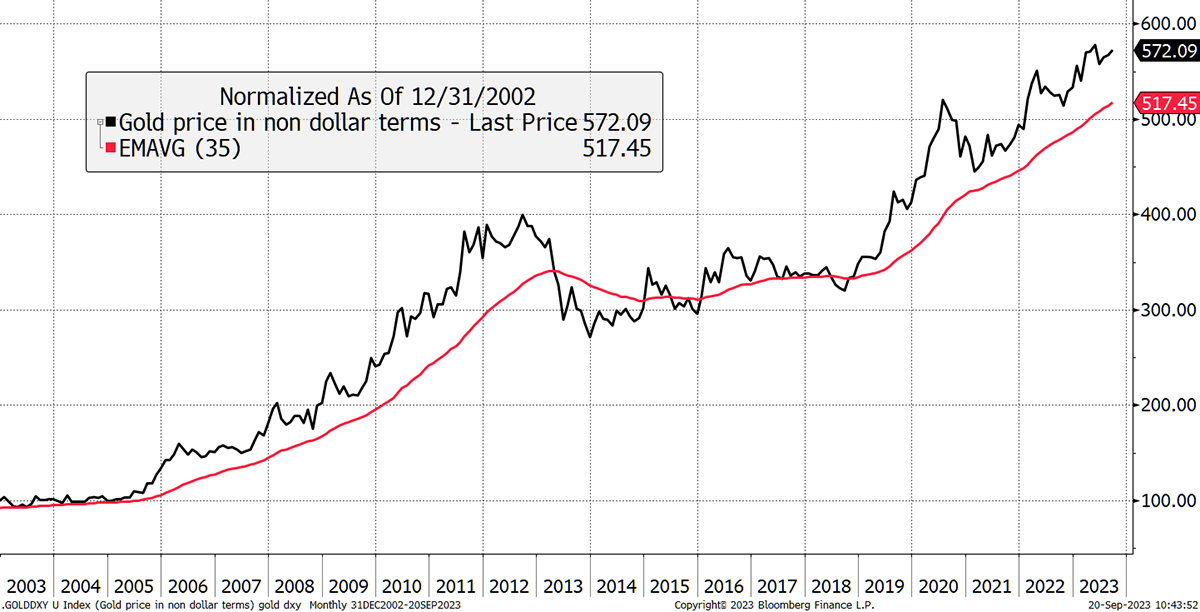 First up, gold remains strong in non-dollar terms as the price is rising in virtually all currencies. Over the past year, only the Mexican Peso is ahead.
