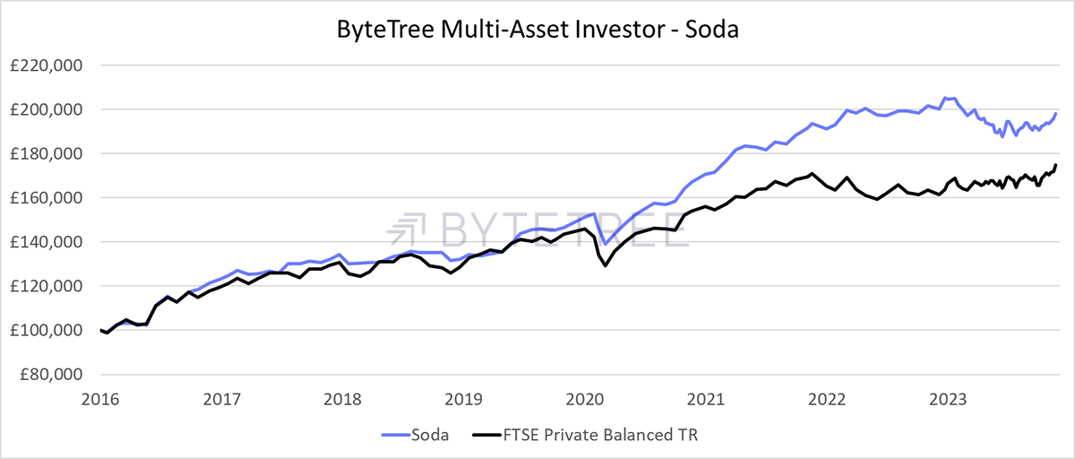 The FTSE Private Balanced Index, a 60/40, rose by 8.2%, meaning the 9% outperformance we had last year has been given back. It’s a brutal comparison, but in the longer term, we are still comfortably ahead, and pulling ahead once again. What you don’t see in the performance data is how Soda has consistently taken less risk than the market, making it less volatile and more resilient to market shocks, something I believe is essential. Yet, in 2023, the shocks were short-lived.