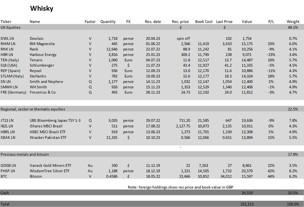 Whisky - a tactical, actively traded portfolio investing in mid to large cap stocks in developed markets, investment trusts, global ETFs and bitcoin. The Whisky portfolio is up by 12.9% this year and up 152.2% since inception in January 2016.