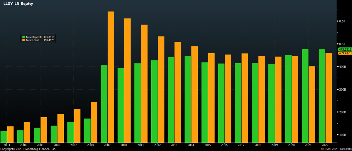 Looking at LLOY’s loans and deposits, you could argue that loans are growing again, which is positive, but deposits remain pedestrian.