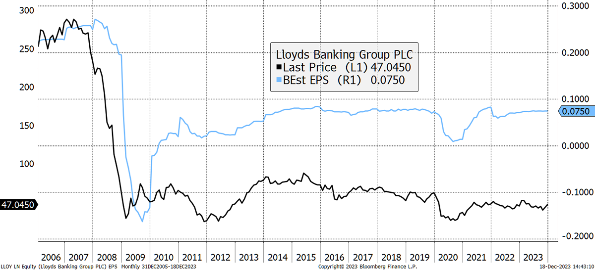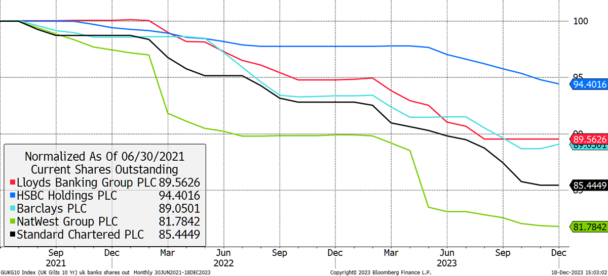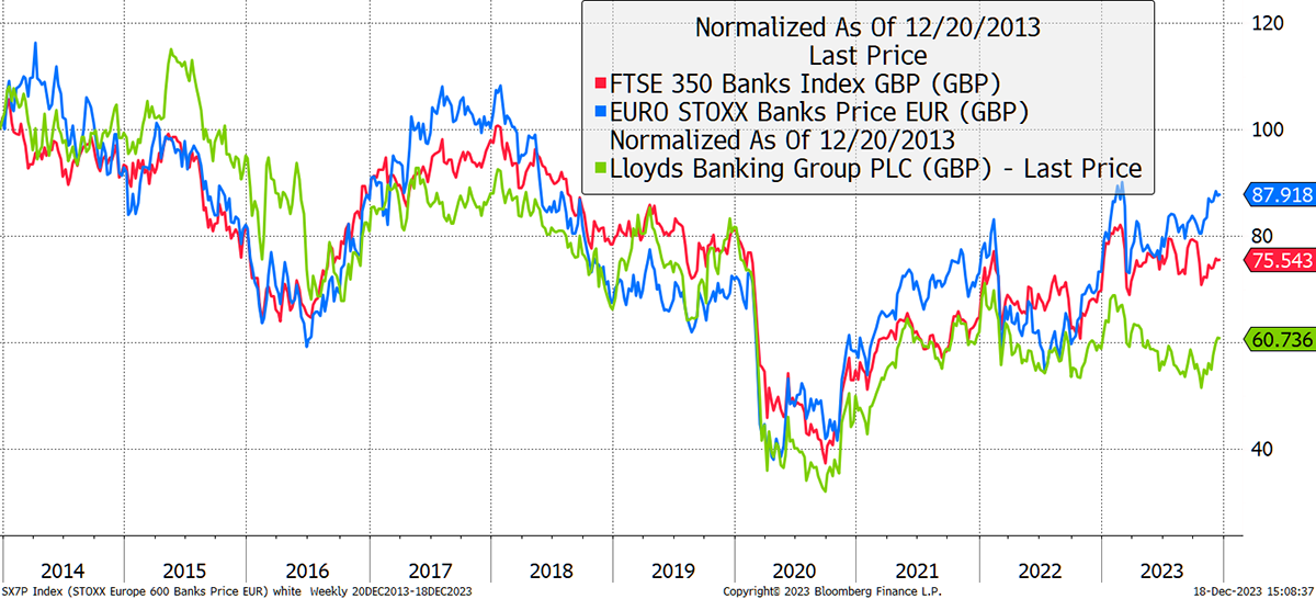 Going back to the pre-pandemic era, LLOY has been the laggard, with HSBC in front, and they trade as a tight group, not just in Europe but across Europe. Maybe LLOY, which has slipped behind, has a catch-up opportunity, but I think the banks are more of a macro decision. That said, they are dirt cheap so we should buy them at some point.