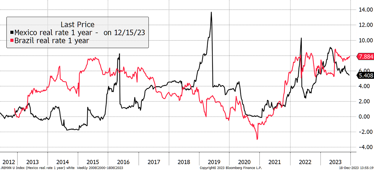 I believe Brazil and Mexico are more sensitive to falling interest rates than commodity prices, but they certainly help. They are currently 7.9% and 5.4% respectively, which is very high indeed.