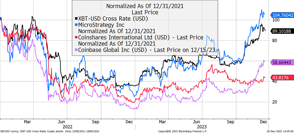 Bitcoin equities are generally terrible, especially the miners, but the asset managers are not a bad choice. They are highly correlated with bitcoin because they generate fees from holding and trading bitcoin and crypto. I show Coinbase (COIN USA) and CoinShares (CS Sweden). I am confident that CS is undervalued, but a mix of the two would be a good bitcoin proxy.