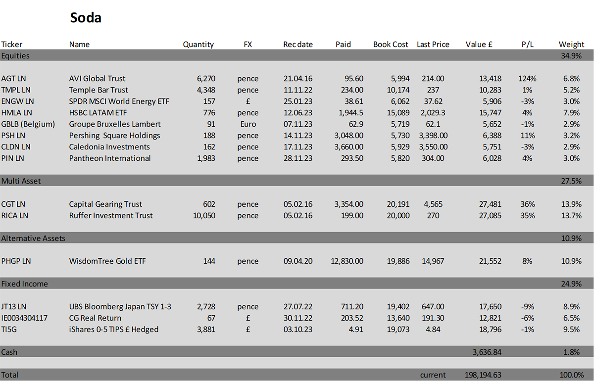 Soda - a long-term, low turnover portfolio investing in diversified large cap stocks, funds, exchange-traded funds (ETFs) and investment trusts. The Soda portfolio is down 1.0% this year and is up 98.2% since inception in January 2016.