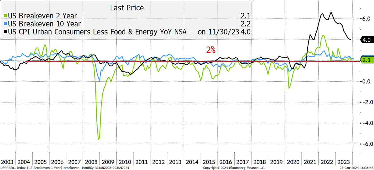 One area of complacency is inflation. I find it strange that the consensus is that it fades away unnoticed. I know that the prices of goods, energy and food have cooled, but wages have not. Inflation expectations, derived from TIPS, used to see 2% as a ceiling, yet now it looks more like a floor. Besides, CPI may be 3.1%, but core inflation is still 4%, and everyone wants a pay rise.