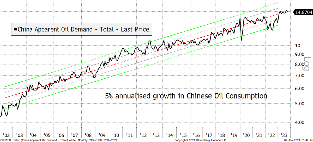 Wars are inflationary, as is diverting shipping around the cape from the Suez Canal. Oil consumption growth marches on, and even in China, where the economy is slowing, the trend growth rate is 5%.