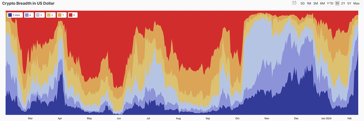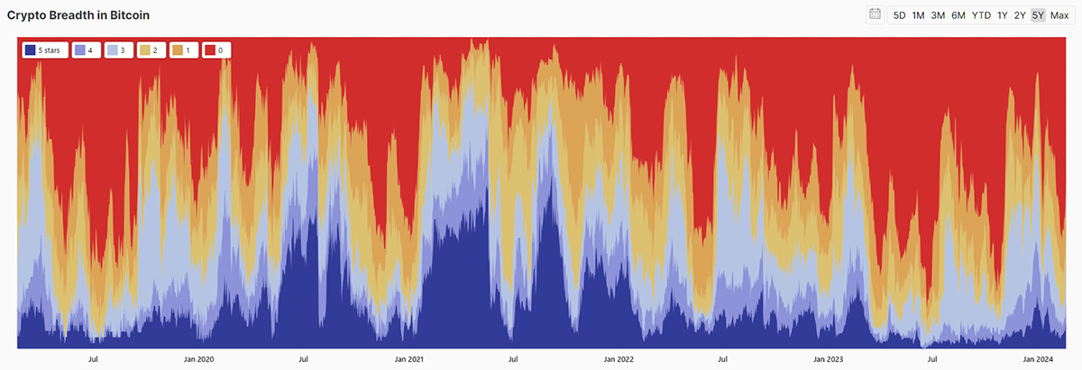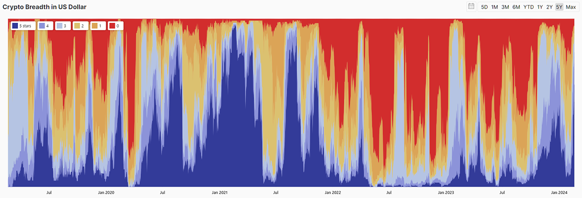 We also see the dollar breadth very strong on this five-year chart. It is heading towards the 2020 levels, which means most coins will have positively sloping 200-day moving averages. To put it another way, downtrends are becoming rare.