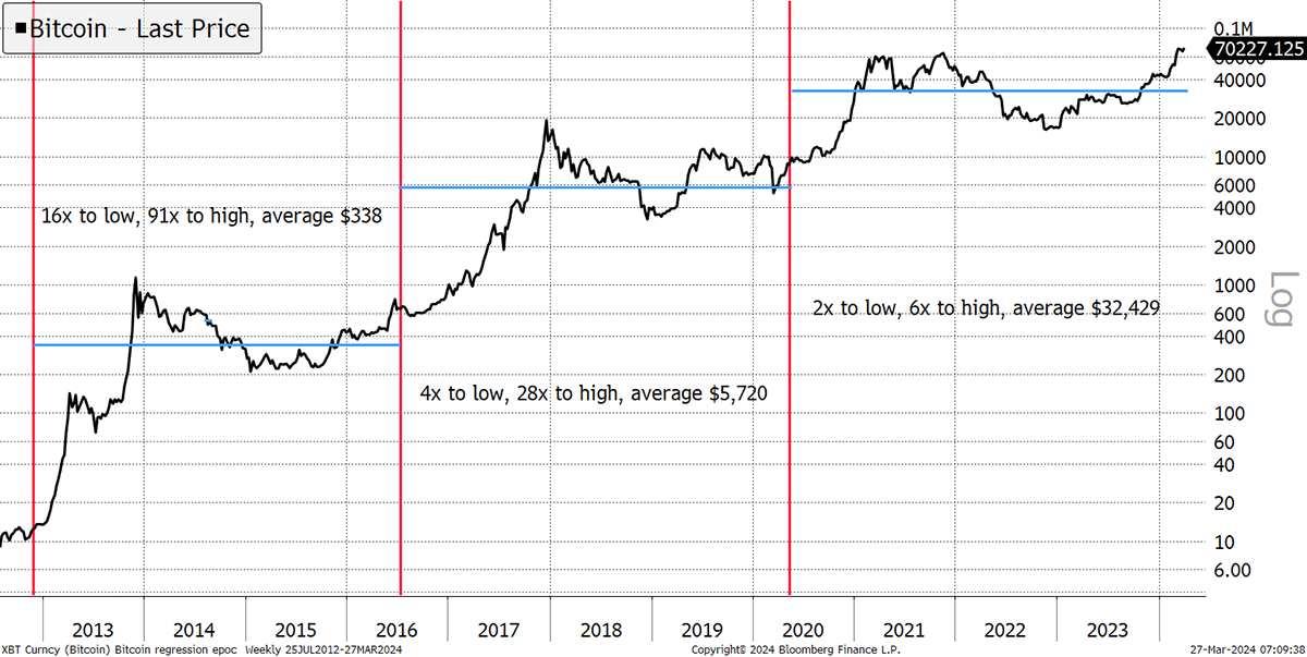 There are realistic limits. Gold’s market cap is $15 trillion, while Bitcoin’s is $1.5 trillion. Perhaps Bitcoin will catch up with gold. While I’m bullish on both, I deem that scenario to be optimistic, but we’ll go with it. If the price doubled each cycle, then the catch-up would happen by 2036, but what then? Would Bitcoin become worth multiples of gold? I very much doubt that.