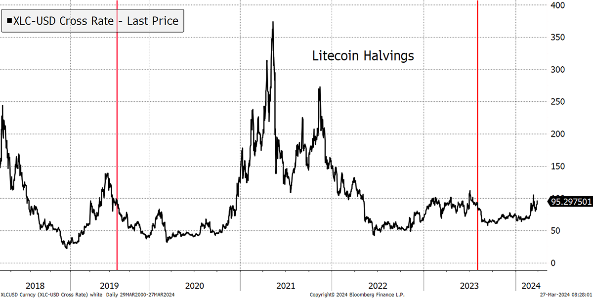 The important point is that Litecoin is not Bitcoin, nor will it ever be, despite having very similar supply-side dynamics. There can only be one, and all of the clones are essentially worthless. Bitcoin has the network effect, and should that wane, the price will fall, just as it has done in the late stages of each cycle.