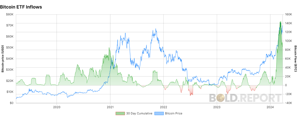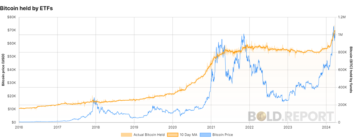 Our data set on Bitcoin (and gold) fund flows has been upgraded on BOLD.report. The number of Bitcoins held by funds was flat between the 2021 high and recently. Then, in Q4 2023, the Canadian and European ETFs saw huge inflows in anticipation of the US ETFs launch, which carried on into Q1 this year. The ETFs have acquired more than a million Bitcoins, which has had a positive impact on price.