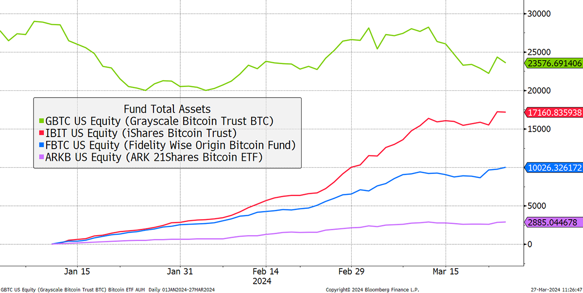 Flows seem to have peaked for the time being, which isn’t surprising given how strong they have been, and I would doubt the halving bulls haven’t already invested ahead of time. To clarify, the iShares Bitcoin Trust (IBIT) is still growing, but Grayscale (GBTC) is shrinking. These ETFs were launched on 10th January when Bitcoin was $46,159. GBTC assets are the same while the price has surged. IBIT has gone from $0 to $17.1 billion in 10 weeks. Fidelity Bitcoin (FBTC) and ARK 21Shares (ARKB) haven’t done badly either.