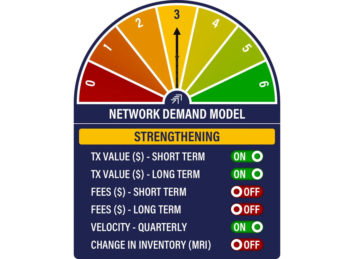 Once again, the Bitcoin Network Demand Model scores 3/6, which is primarily due to low fees. The important point is that spend, which is linked to price, remains strong.