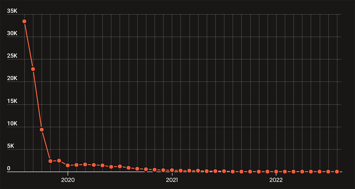 The above chart illustrates a significant decline in the average monthly earnings for Helium Hotspots. Some operators of Helium Hotspots, also known as HNT miners, have voiced concerns that despite a notable decrease in the number of active Hotspots, the rewards have not only failed to increase but have actually dropped further. There have been claims of earnings dropping as low as 20 cents per day. At this point, it’s important to highlight that the rewards are not paid in dollars but as token incentives.
