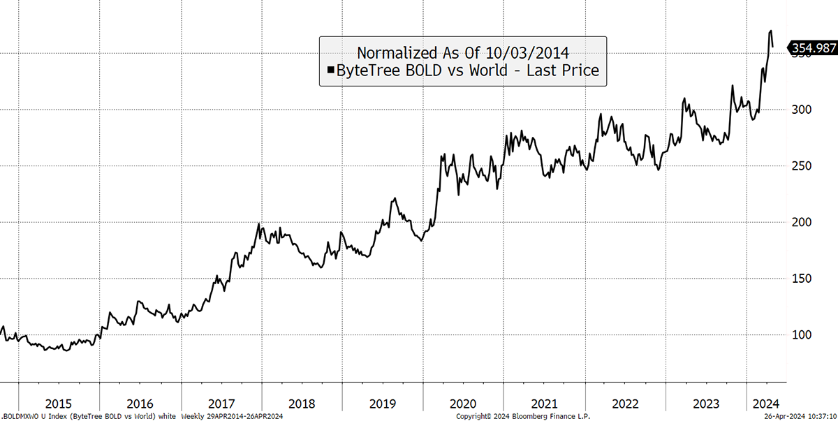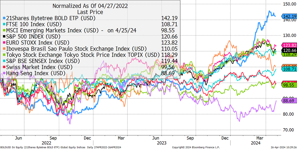 On 27th April 2022, I rang the bell at the SIX Exchange in Zurich to launch the 21Shares ByteTree BOLD ETP (BOLD SW). It was an unfortunate time as Bitcoin soon faced one scandal after another, and within weeks, BOLD had slumped below the world’s stockmarkets.