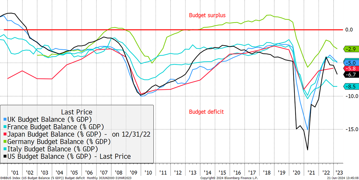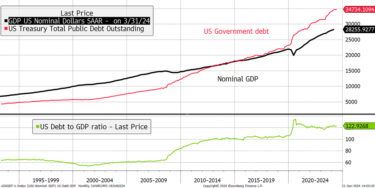 We have seen lower inflation, which has led to expectations for lower interest rates. There has already been a cut in Europe and Canada, yet there’s a problem, and given there are elections all around us, you have probably spotted it. No one who is planning to lead our great nations is talking about debt and deficits. They are at record levels seen during the history of peacetime, and they are getting worse.