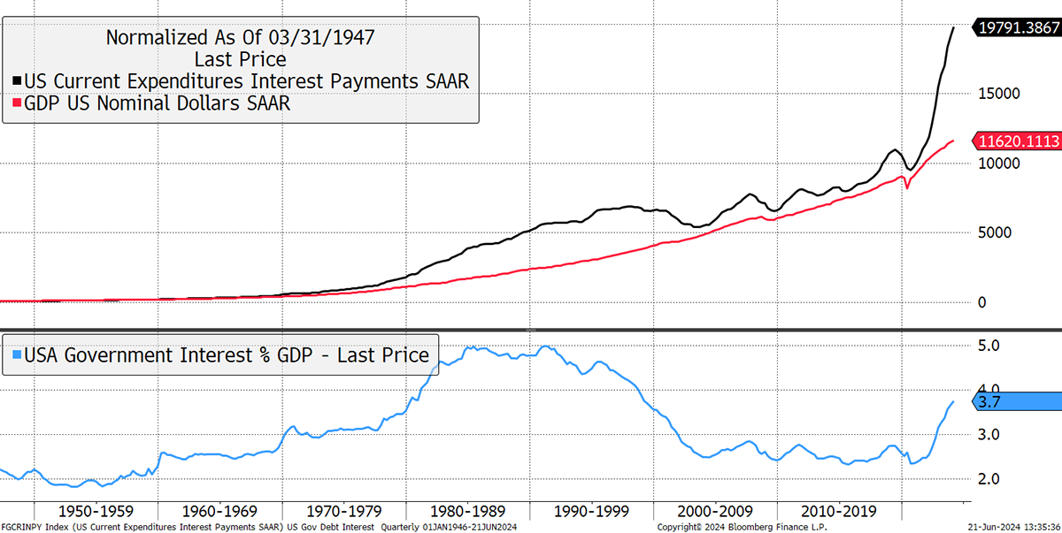 The trouble with debt is that eventually, it is supposed to be repaid, and in the meantime, the interest bill mounts up. Nominal GDP includes inflation, and it has been rising (red). However, with interest rates rising in recent years, the high level of outstanding debt must be refinanced at higher rates. That has caused a squeeze in government spending as interest payments (black) grow. They now amount to 3.7% (blue) in the USA and are on their way to the 5% high seen in the 1980/90s.