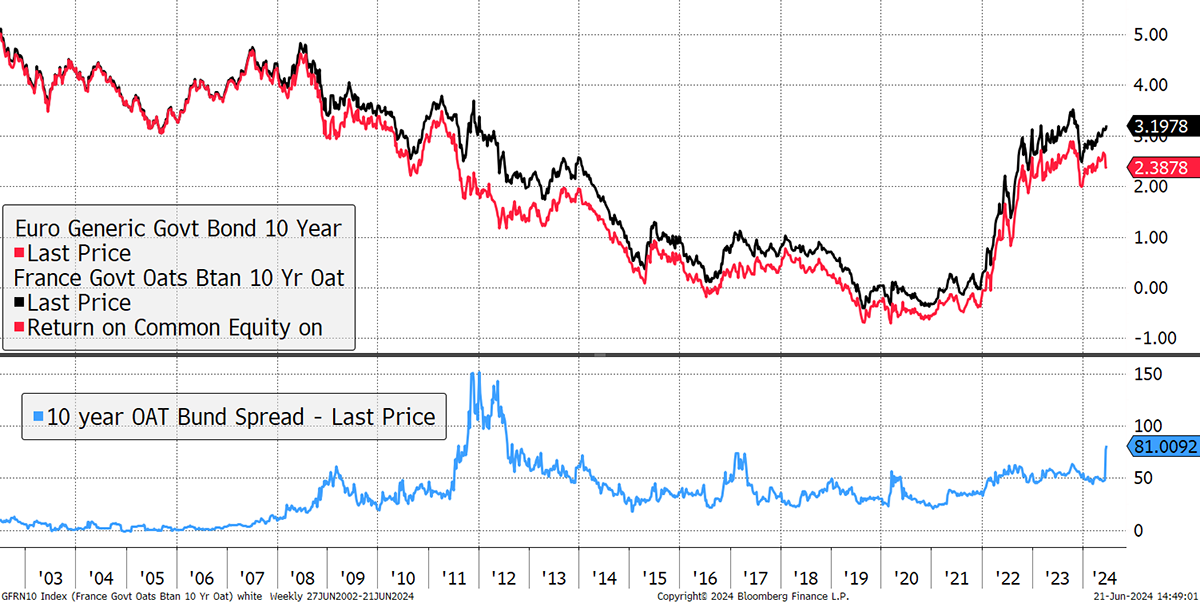 In The Multi-Asset Investor, I was asking the bond questions, highlighting the risks to bond spreads. In France, yields are rising, while in Germany, they are falling. Might this catch on?