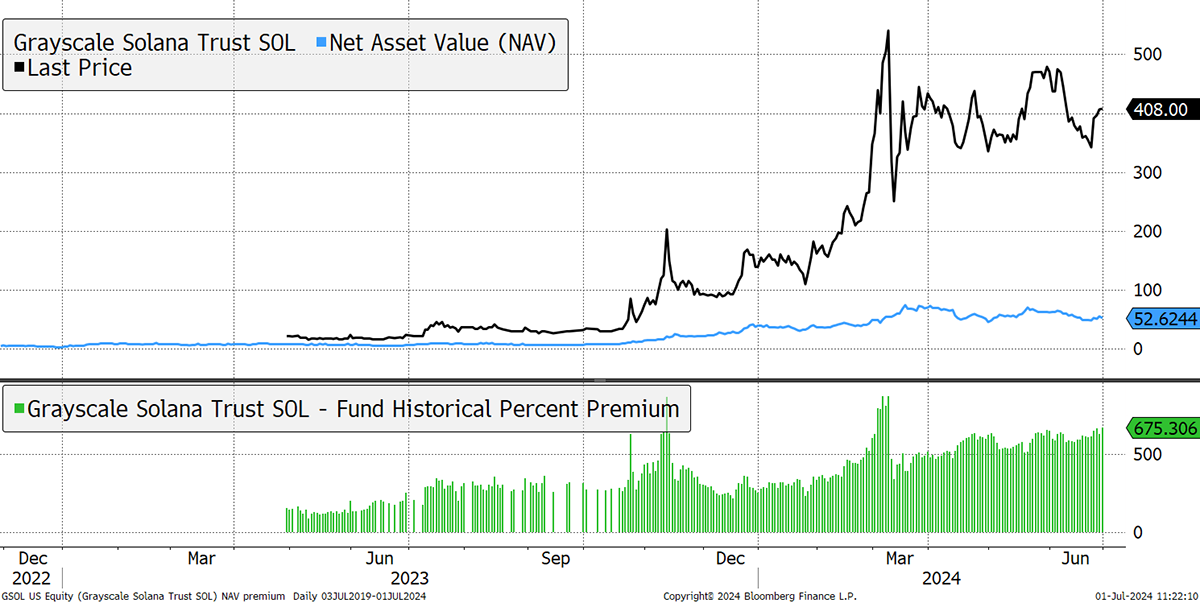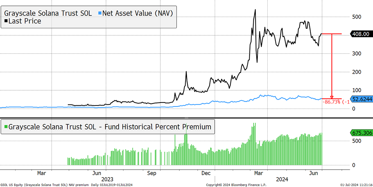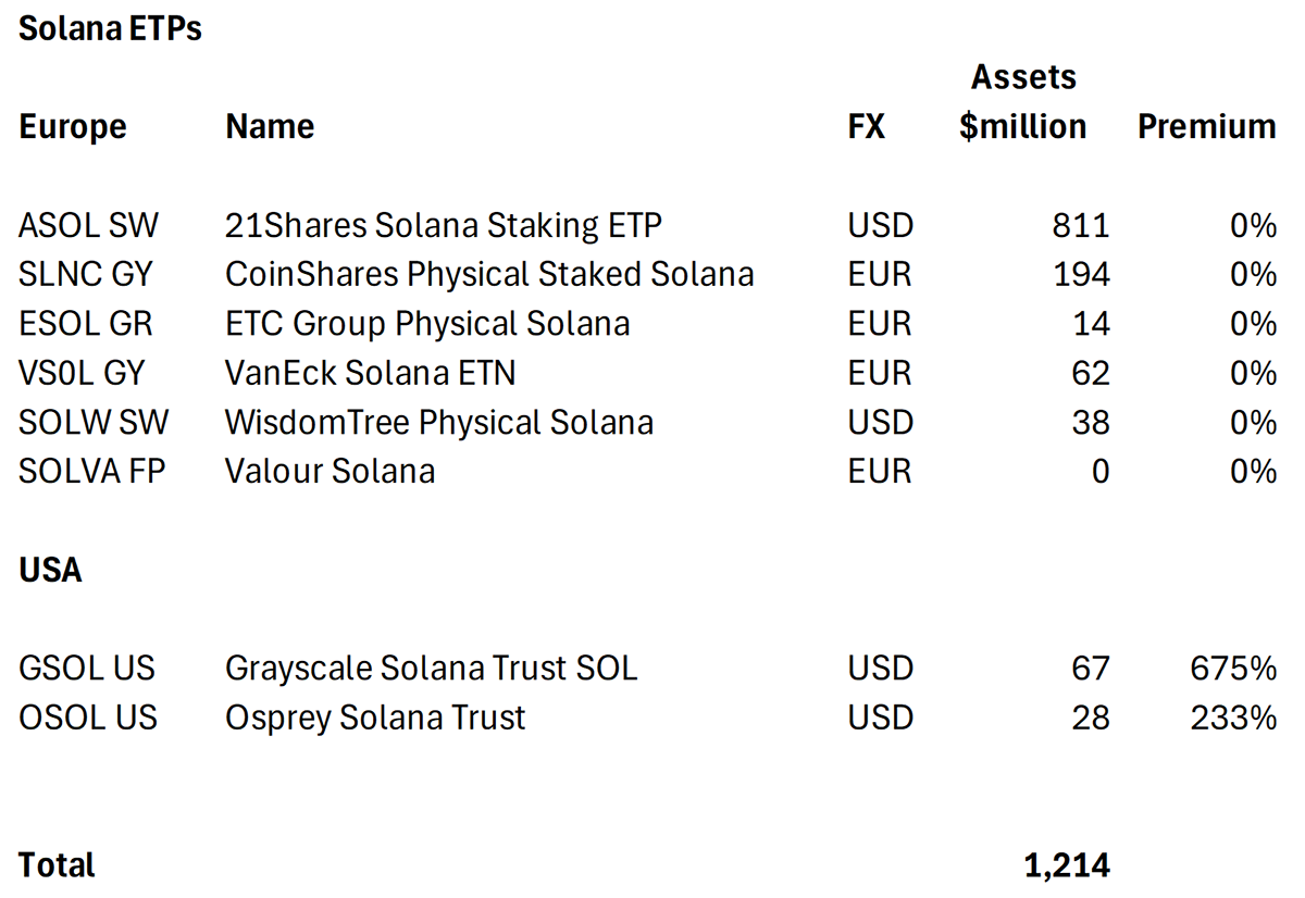 In the case of SOL, it is remarkable that the two US closed-ended funds trade on eye-watering premiums. Grayscale Solana (GSOL) trades at a 675% premium, and Osprey, 233%. I assumed the data were wrong but the factsheet confirms it. GSOL holds $66.7 million of SOL yet has a market cap of $518 million.