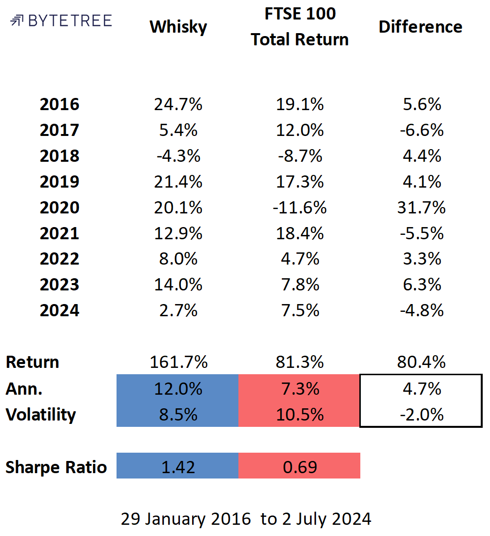 2024 has slipped slightly further behind, although the last week has seen Whisky jump to 5%, thus halving the gap. I have little doubt that when the great rotation out of big tech begins, the Whisky Portfolio will spring to life. Since 2016, it has done twice as well as the market with 2% less volatility, leading to materially higher risk-adjusted returns.