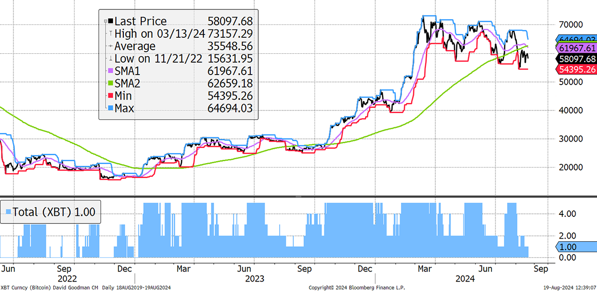 Then the ByteTree Crypto Average, our breadth measure, is slack, meaning the average token is still under pressure. Crypto performance tends to be an all-or-nothing affair, and the breadth has been deteriorating since March.