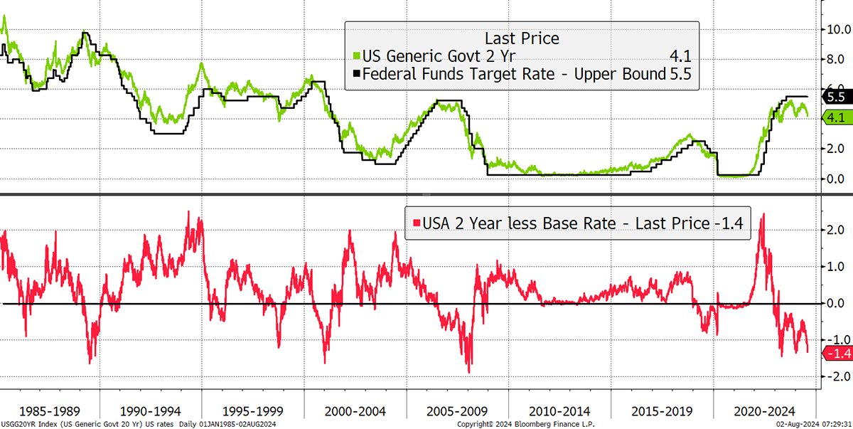 The shorter-term two-year yield and the base rate (set by the Fed), highlight how the market believes the Fed are behind the curve. For over a year, the two-year has traded around 1% below interest rates, implying the market expects cuts. Previous occasions include the late 1980s housing bust, the 1997 Asian Crisis, 2000 Dotcom, and the 2008 banking crisis.