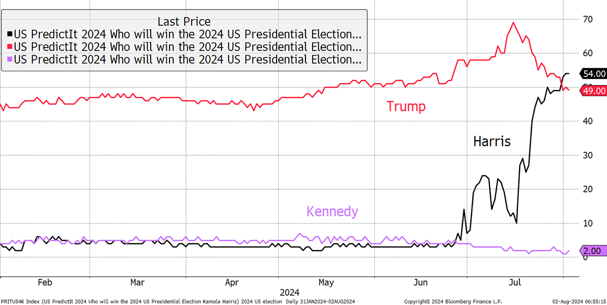If the uncertainty from the macro isn’t enough, then consider the politics. The markets have also felt the pressure of disruption. Knowing that Trump was going to win was a known-known, whereas Harris is a known-unknown, and she’s in the lead.