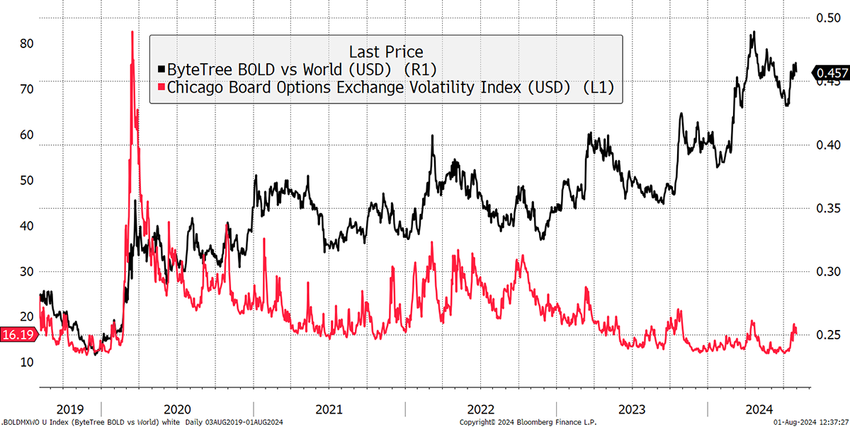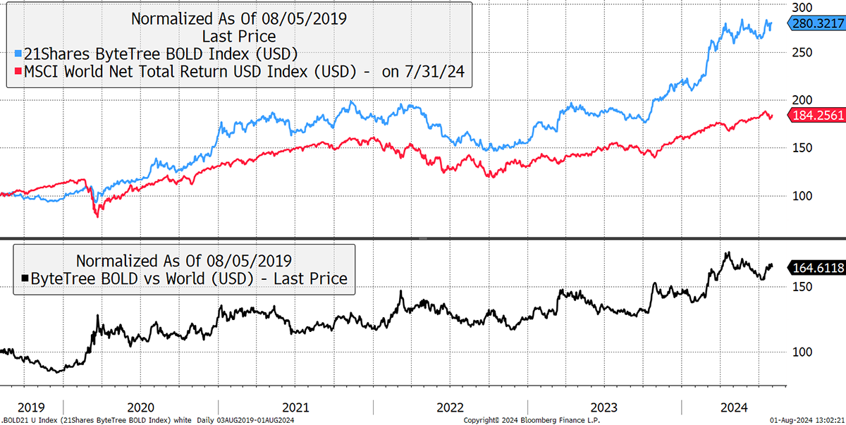 What’s interesting is that despite holding Bitcoin, BOLD tends to beat the stockmarket at times of stress. Not only that, but it has also had a tendency to hold onto that excess return when the stockmarket has recovered. $100 invested into BOLD five years ago is worth $280 today, in contrast to $184 in global equities, including dividends. The black line below shows BOLD compared to Global Equities, which tends to have a positive trend.