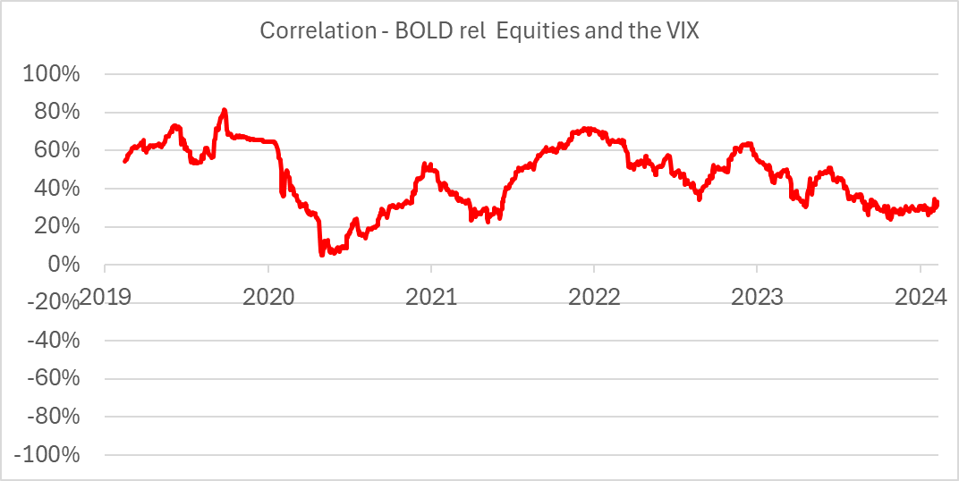 Next, we move to the correlation between the relative performance of BOLD (BOLD relative to Global equities) and the VIX. The VIX rises at times of stress, so if BOLD can beat the market during such times, it is indeed a defensive asset.
