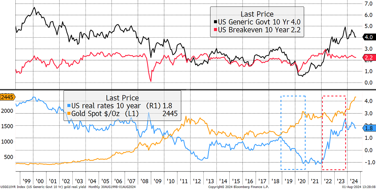 Real interest rates (blue) are the interest rate (black) less inflation expectations (red). We all know Gold likes falling real rates as seen in 2019/20 (blue box). When they surged in 2022/23 (red box), Gold stood its ground. The inverse correlation between real interest rates and the price of Gold hasn’t gone away; Gold simply looked through to the long term and ignored this cycle of higher real rates.