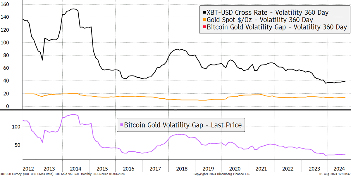 BOLD allocates Bitcoin and Gold on a risk-adjusted basis, using past volatility, which is calculated using daily price movements. The less volatile asset, which has lower daily price moves, gets a higher weight in the index at the end of the monthly rebalancing. Bitcoin’s volatility, measured over a year, has fallen significantly since the early days and is now no more volatile than a typical blue-chip stock.