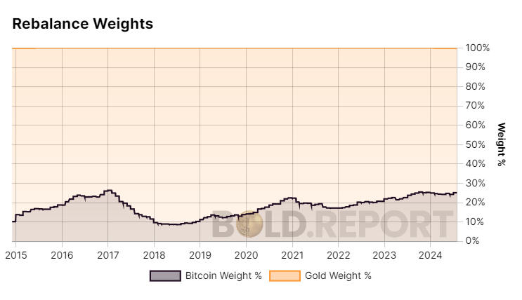 Yet when you refer to the one-year data above, when Bitcoin surged by 121%, it is clear that mixing in lower-return Gold reduces returns. Due to higher Bitcoin volatility in 2023, the start weight was 22.8% Bitcoin and 77.2% Gold. In that instance, there was also a modest excess return, despite the price of Bitcoin rising rapidly over the fixed-weight alternative.